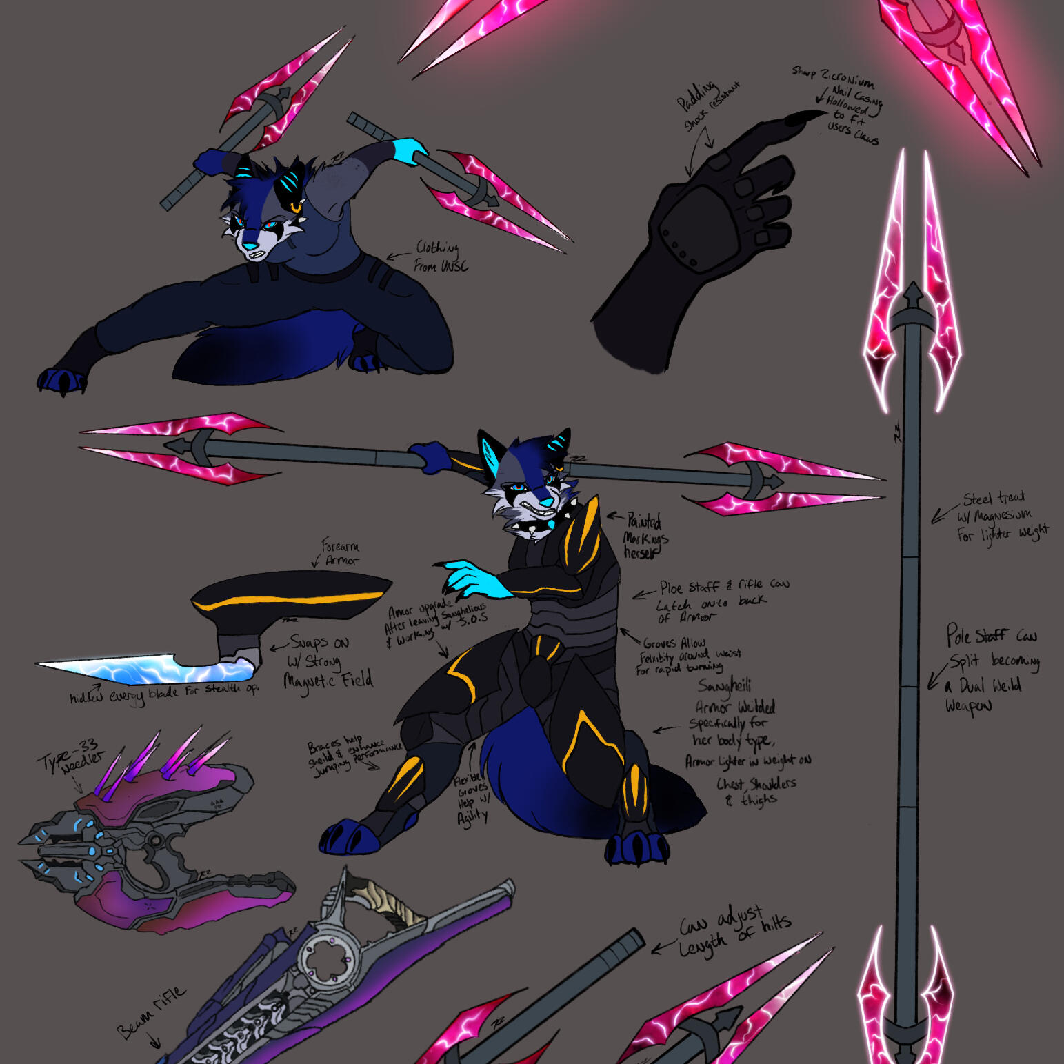 Concept pages are one page full of poses to one page filled with a few poses. It is all sketched and flat colored. Weapon designing is included in concept art
